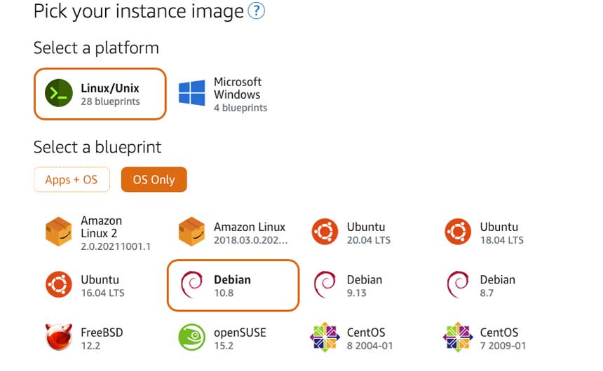 Following our case, pick your instance image by clicking on "Linux/Unix" blueprint choose "OS Only" and select Debian11.x.